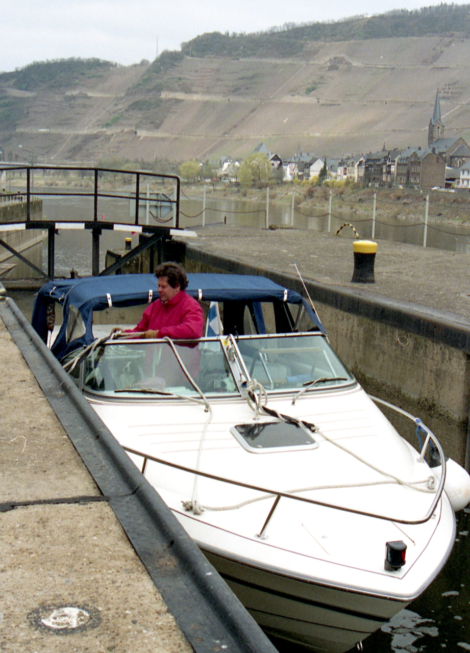 Vene on ensi kertaa puoliksi cabriolet mallisena. Pääsemme ensimmäisenä sulkuun jossa kaksi jokialusta ja kolme huvivenettä. Sulun jälkeen aurinkoinen ilma lämmittää mukavasti. Veneilyelämä tuntuu heräävän henkiin. Mosel vaikuttaa heti ensi silmäyksestä lähtien veneilyyn keskittyneeltä, satamia yllin kyllin. Kuulimme Rheinillä Bootshaus Grünistä joka sijaitsisi styypuurin puoleisella rannalla.