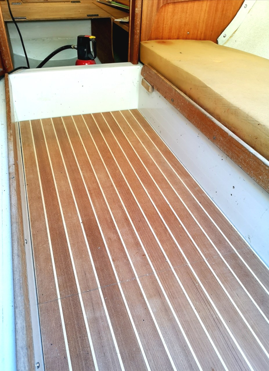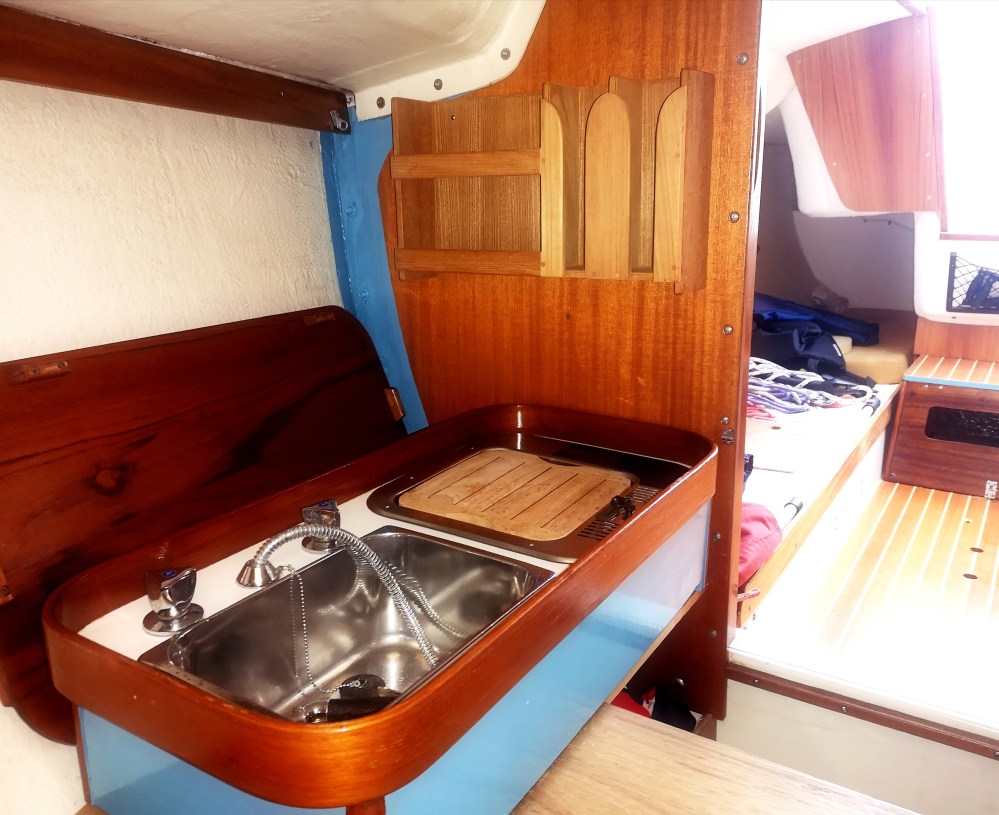 I had removed all the plywood except the main bulkhead. The old and heavy pentry had to go. New pentry is going to be a module with a sink and an Origo gasol burner. The cups are hanging on main bulkhead. The pentry is situated on Starboard side in front cabin. The Wallas heater is on Port side, mounted on the bulkhead. The rest of the front cabin bunks are going to be sail bin and for various sailing gear. Main cabin is with two sofas / bunks and a smaller removable coffee table. One extra bunk is under the cockpit seats. It was quite easy job, laquering the parts in my house and quite simple attaching work.