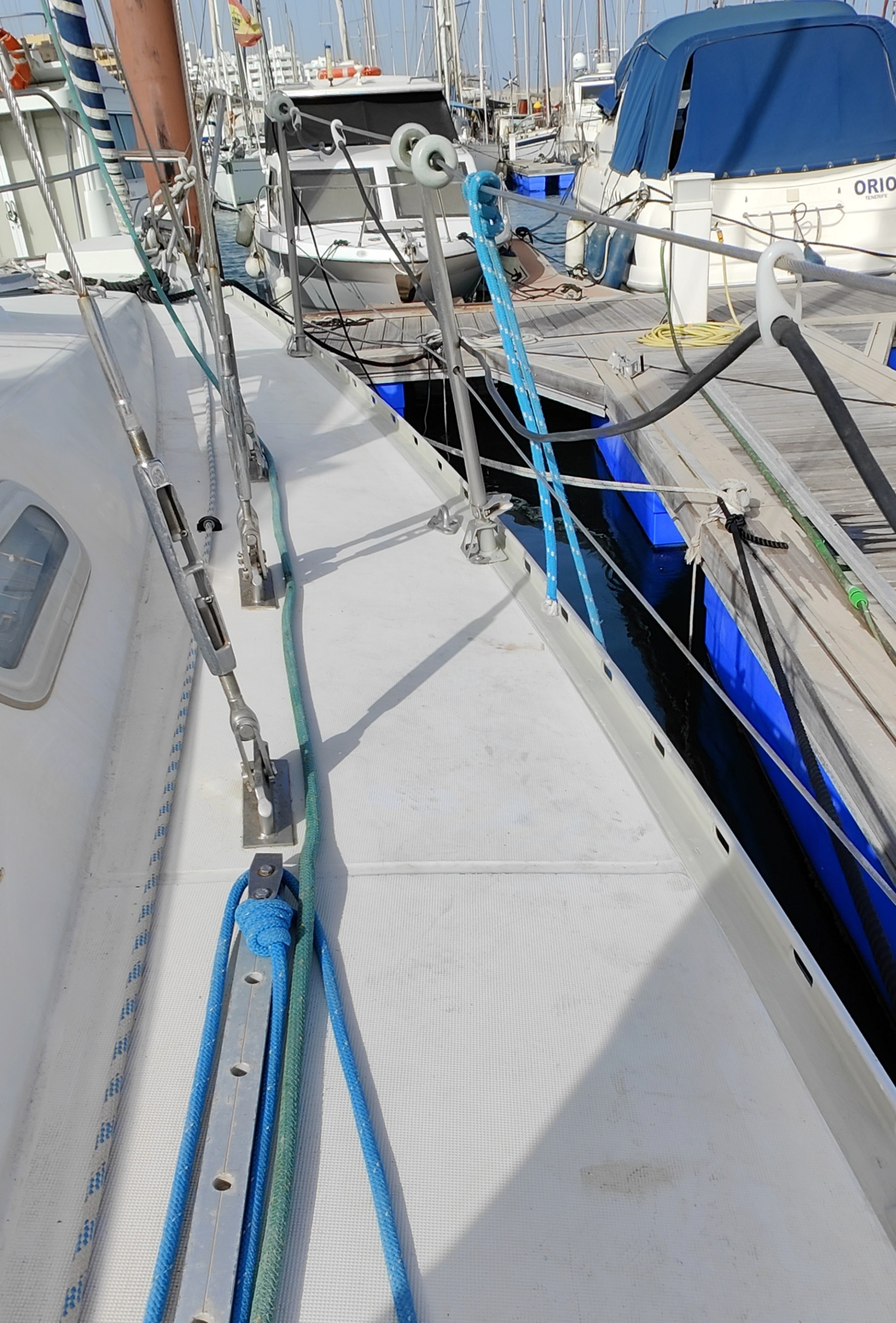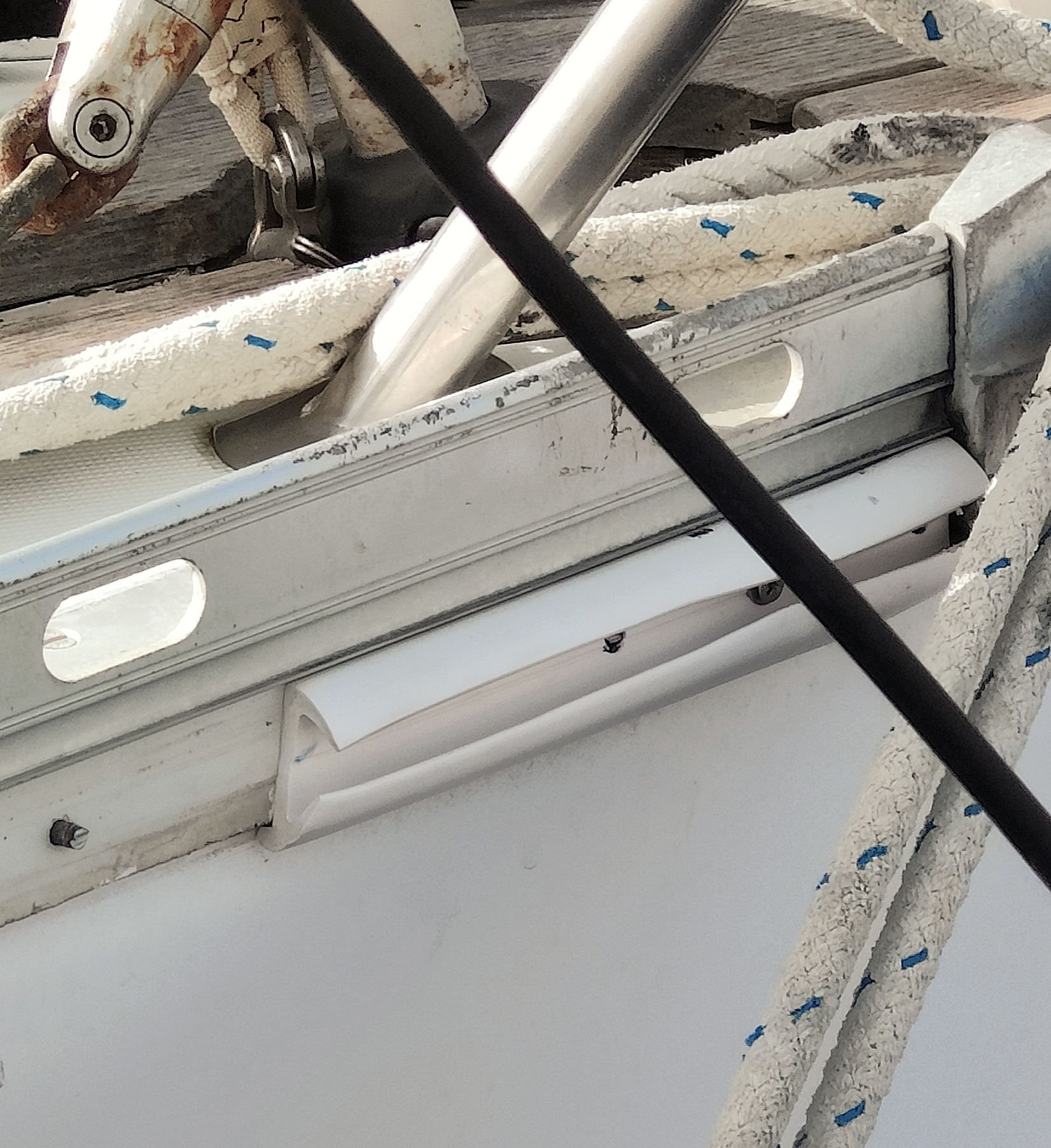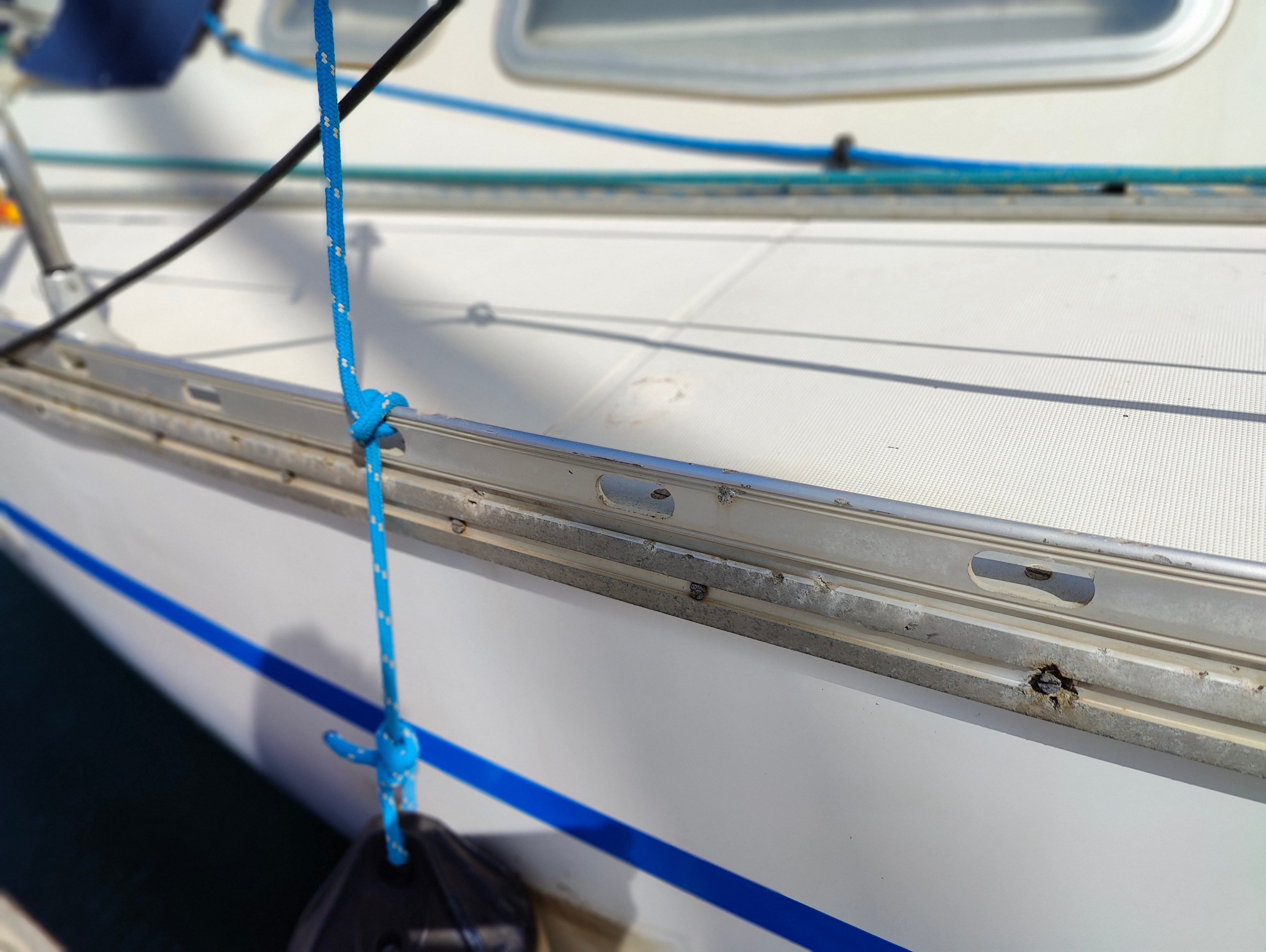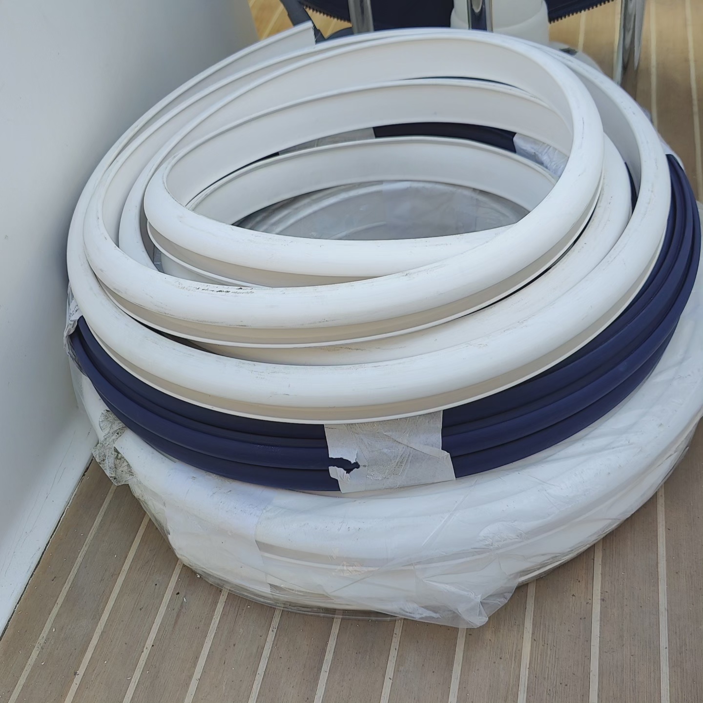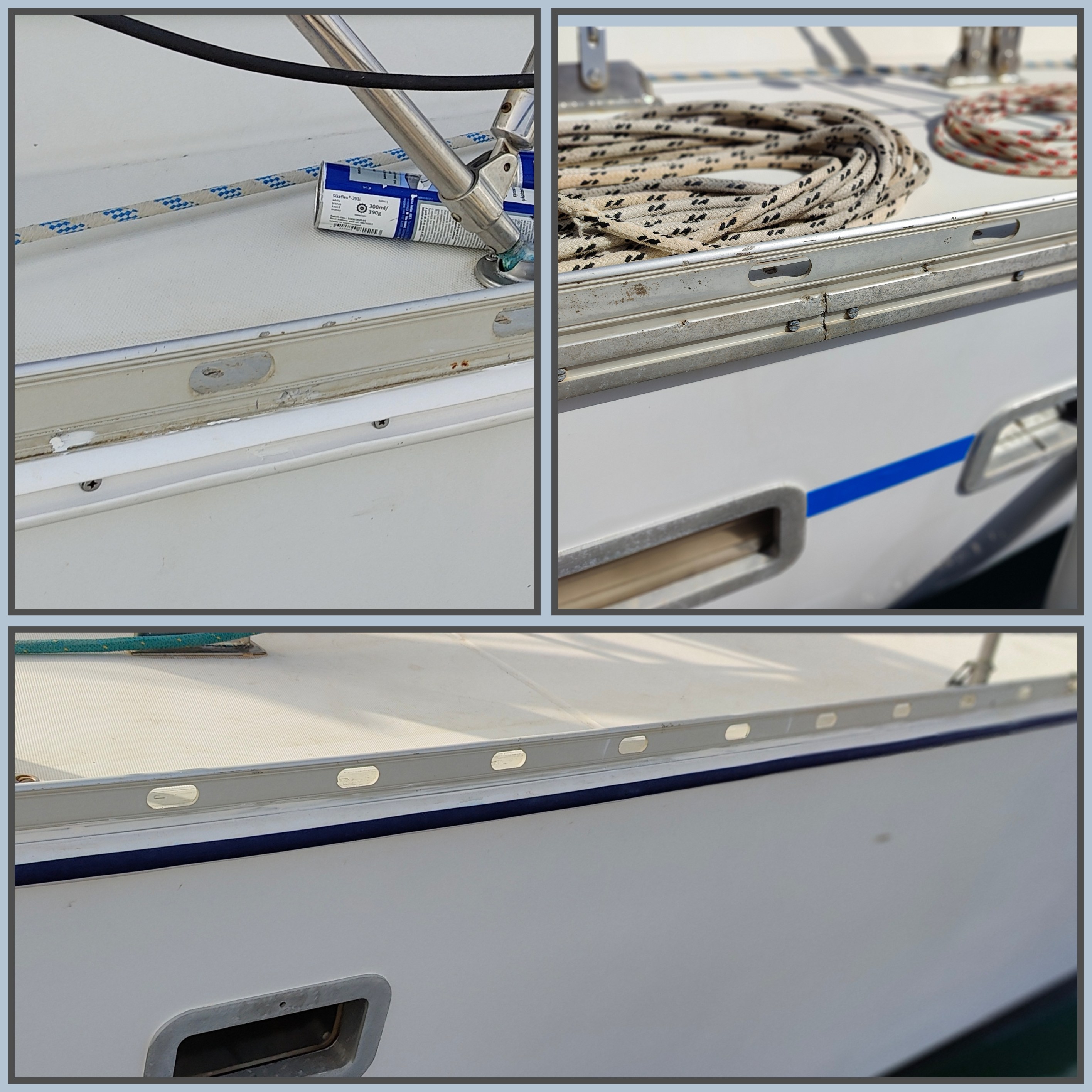 New lists, Poly 40mm we got from Blancomar in Santa Cruz de Tenerife Around 700 € . A complete store for boating people. After removing the old lists and cleaning the joint. I actually let the old screws stay there and drilled a guiding hole to the new plastic list. Before applying Sikaflex and new Stainless steel screws this method helped me line up the list. In this manner I let the old screws stay to strenghten the hull joint. I had a perfect guiding line .
