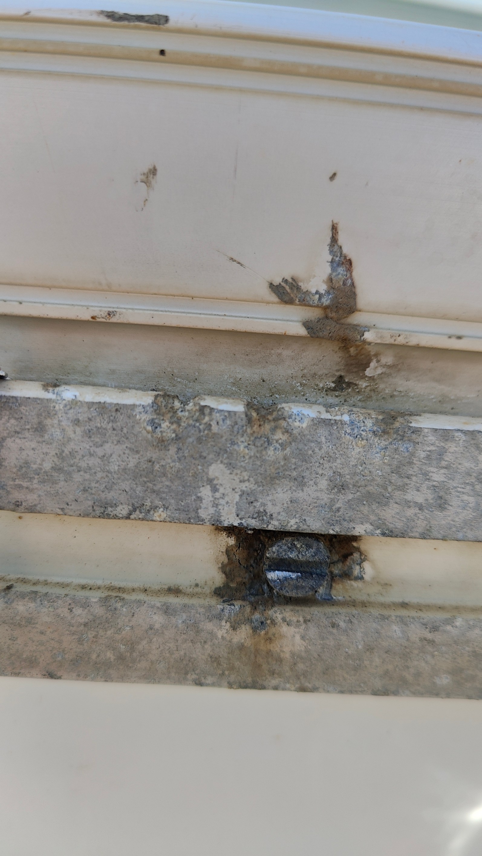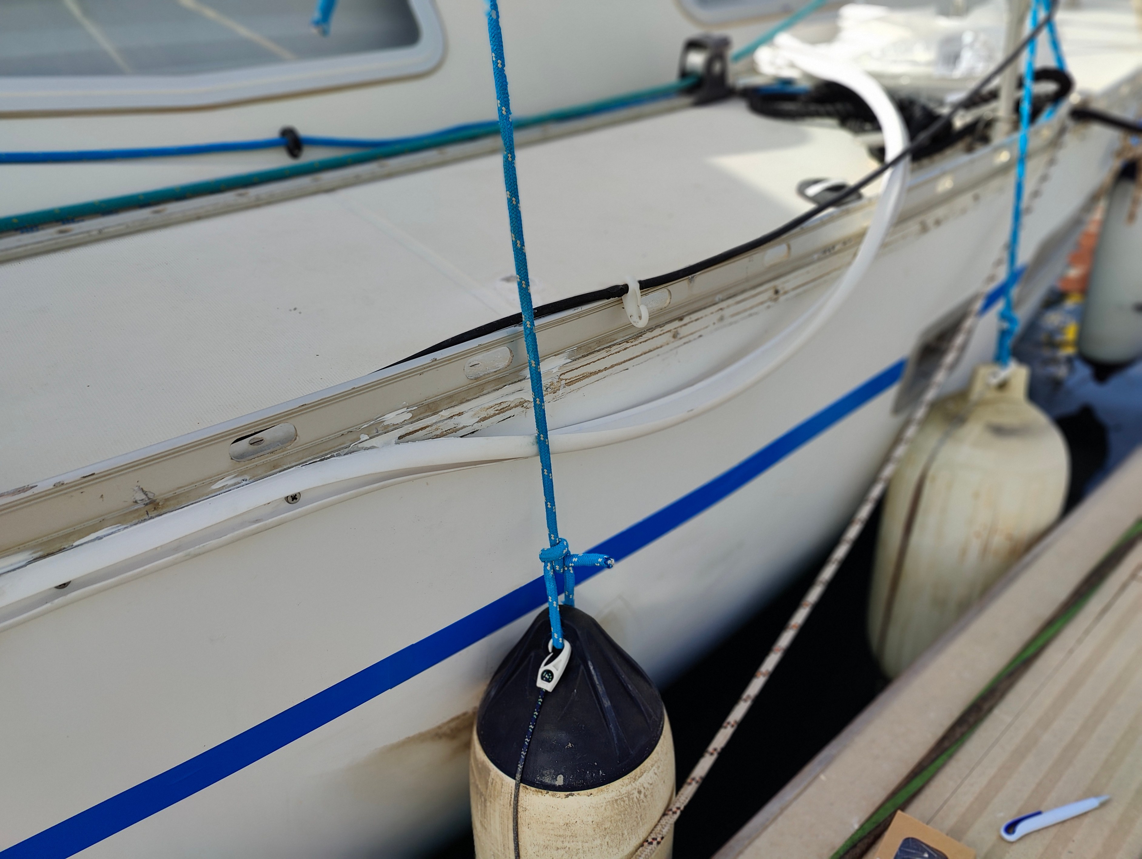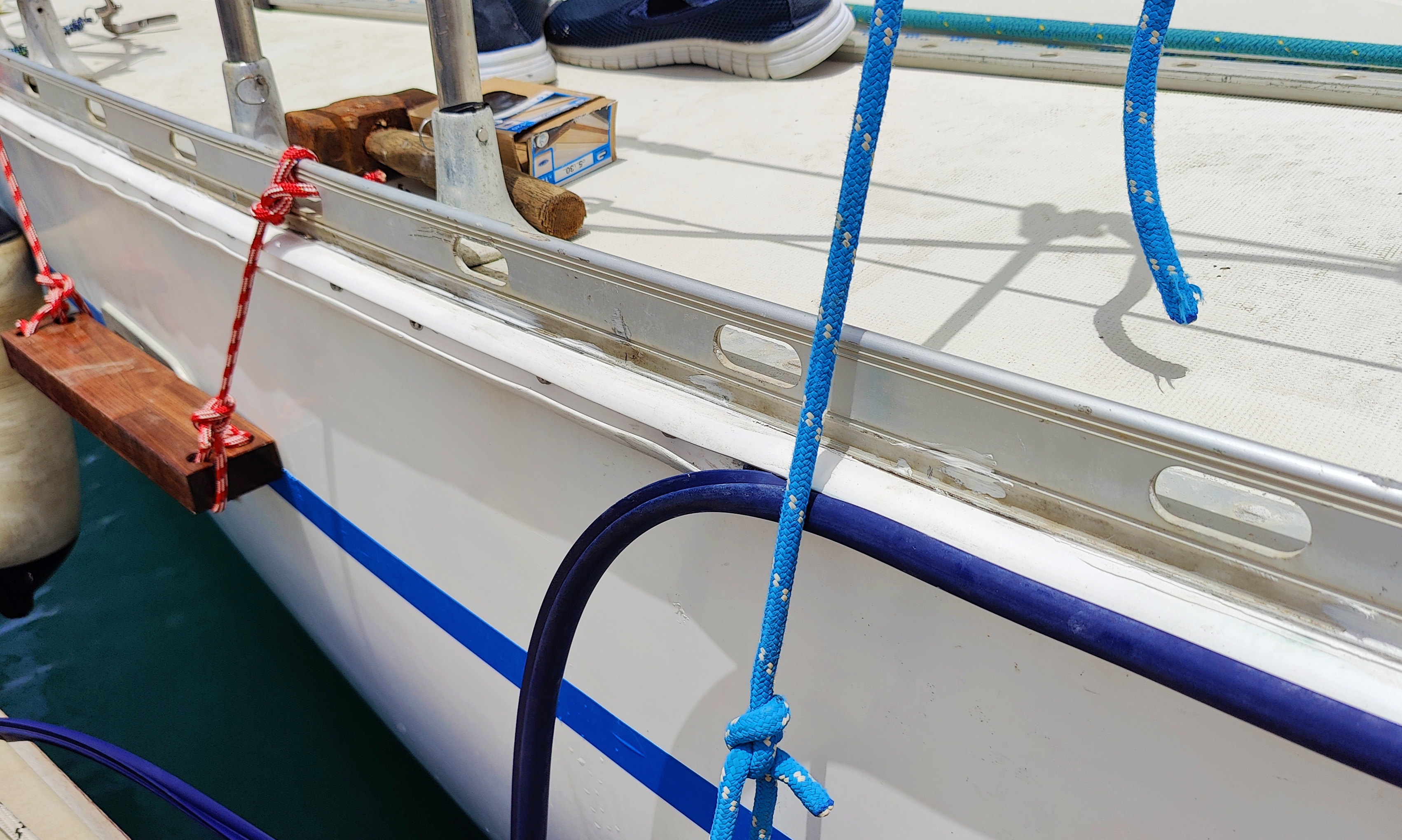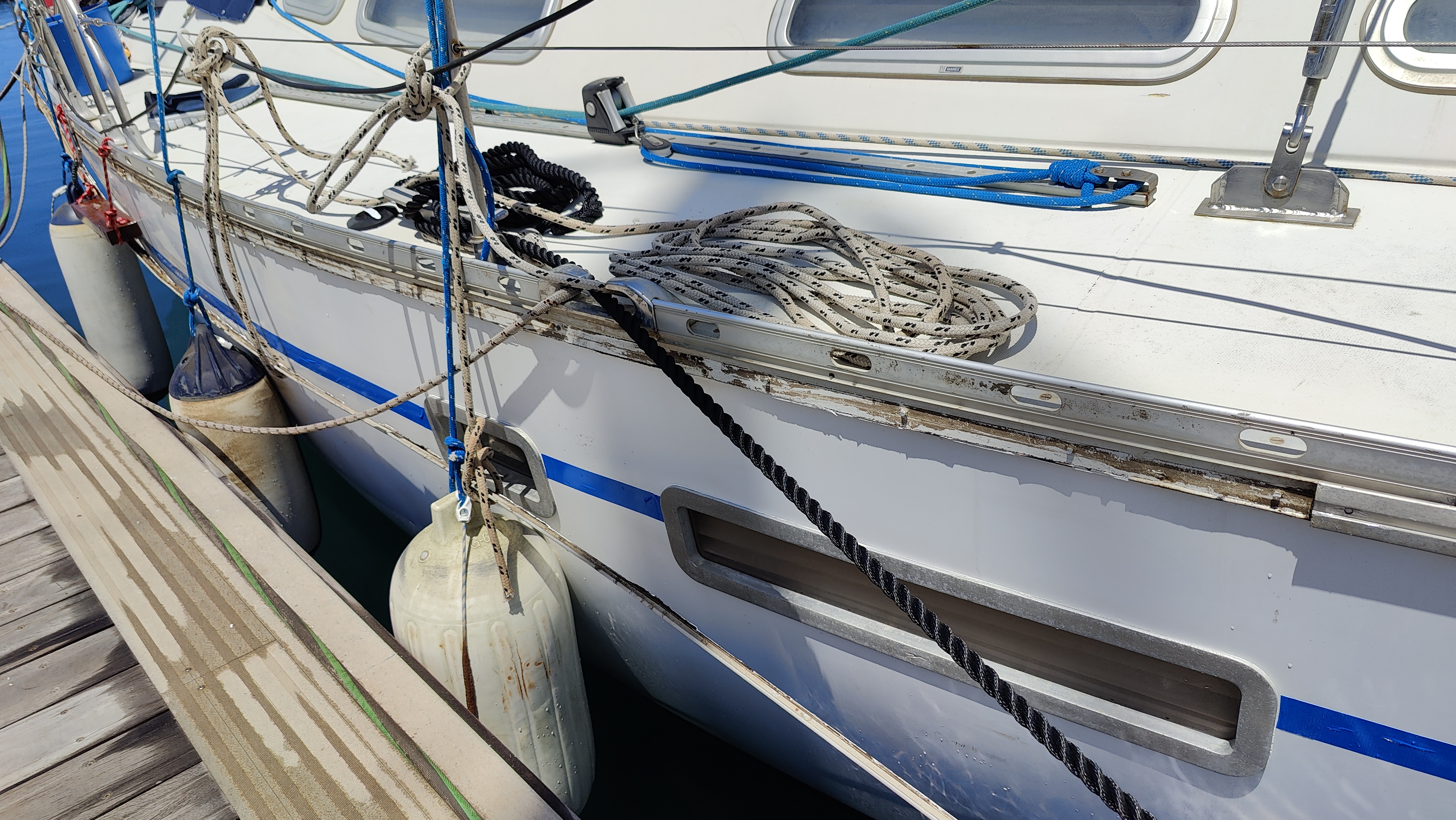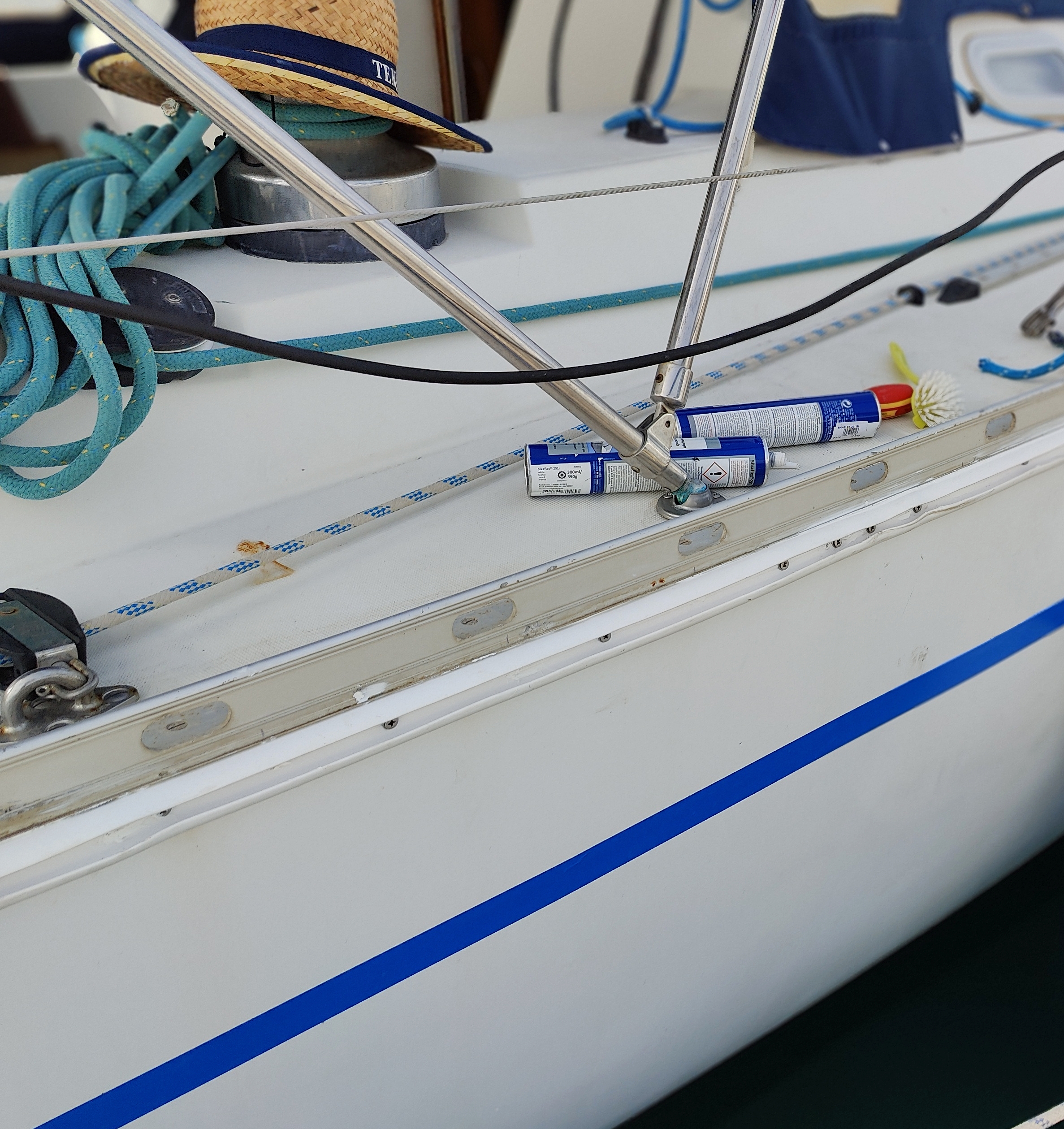 New lists, Poly 40mm we got from Blancomar in Santa Cruz de Tenerife Around 700 € . A complete store for boating people. After removing the old lists and cleaning the joint. I actually let the old screws stay there and drilled a guiding hole to the new plastic list. Before applying Sikaflex and new Stainless steel screws this method helped me line up the list. In this manner I let the old screws stay to strenghten the hull joint. I had a perfect guiding line .