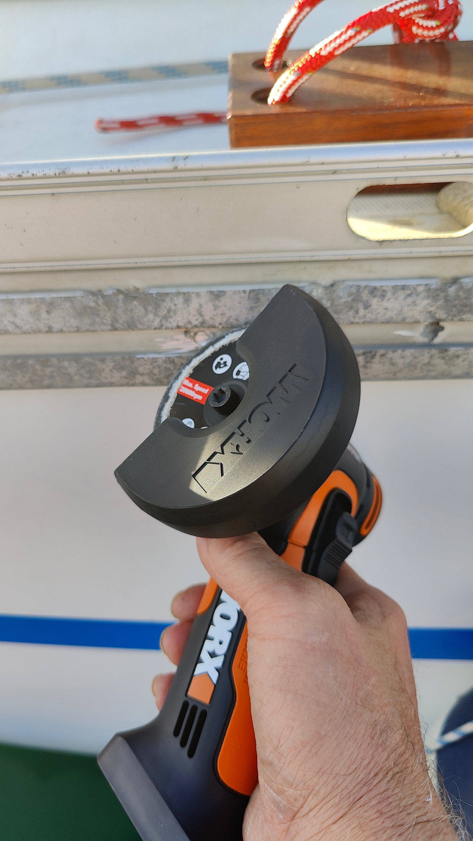 The big job this time was changing an old rubbing list of aluminium outside the hull joint. The reason I wanted to remove the old corroded list was keeping the corrosion away from the aluminium toe rail that is also connecting the deck to the hull with mechanical joint. The screws had corroded with the list, so I decided to grind them away. After that it was easy to remove the list. A fine and powerful tool (battery operated, Worx brand) This small tool was ideal to cut the SS screws. Tool from Leroy Merlin in Adehe, 57 €