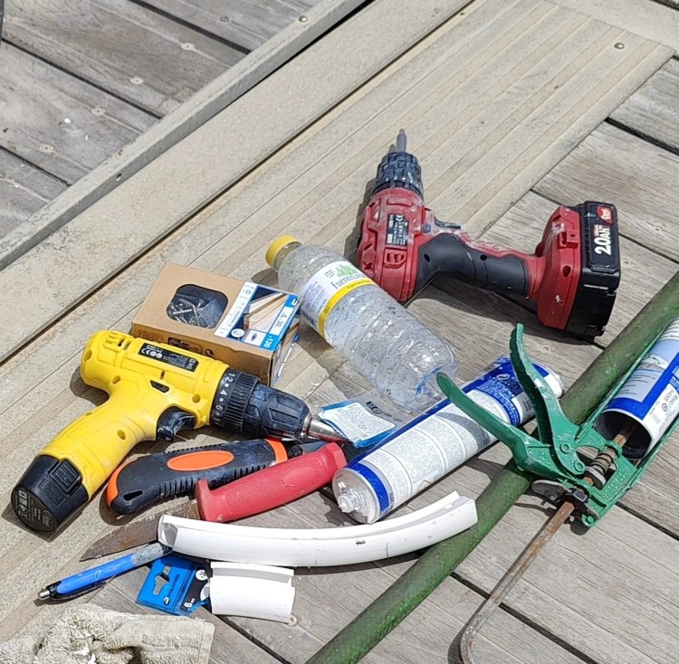 Tools needed for the operation, cleaning agent, water and a few tubes of Sikaflex. Water also for the hard working man