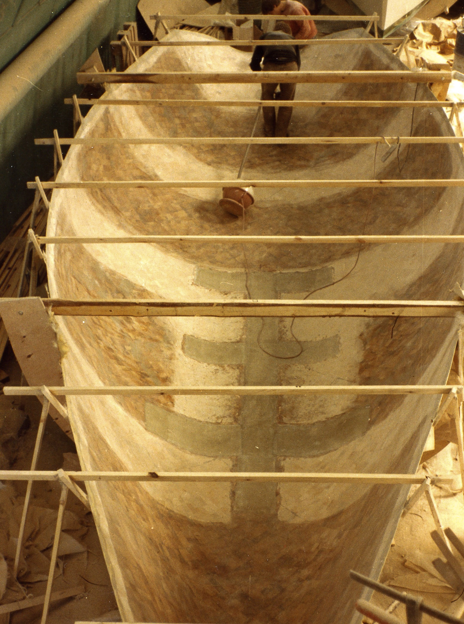 - The biconvex hull shape, solid hand laid fiberglass construction of the hull. Hull laminate is made with a lot of fiberglass rowing mats. Hull is stiffened with a lot of vertical and horizontal stringers, which share the whole hull into panels with width of approx. 70 x 70 cm.