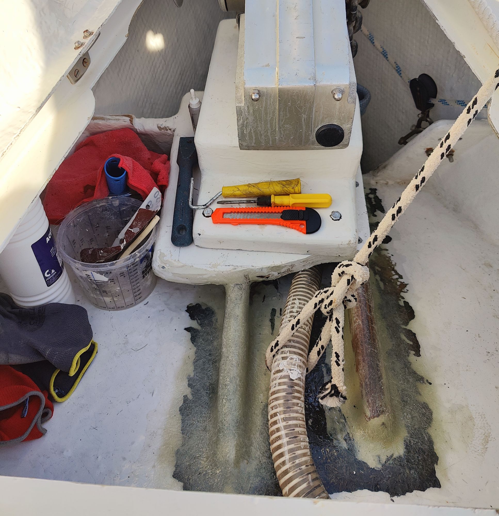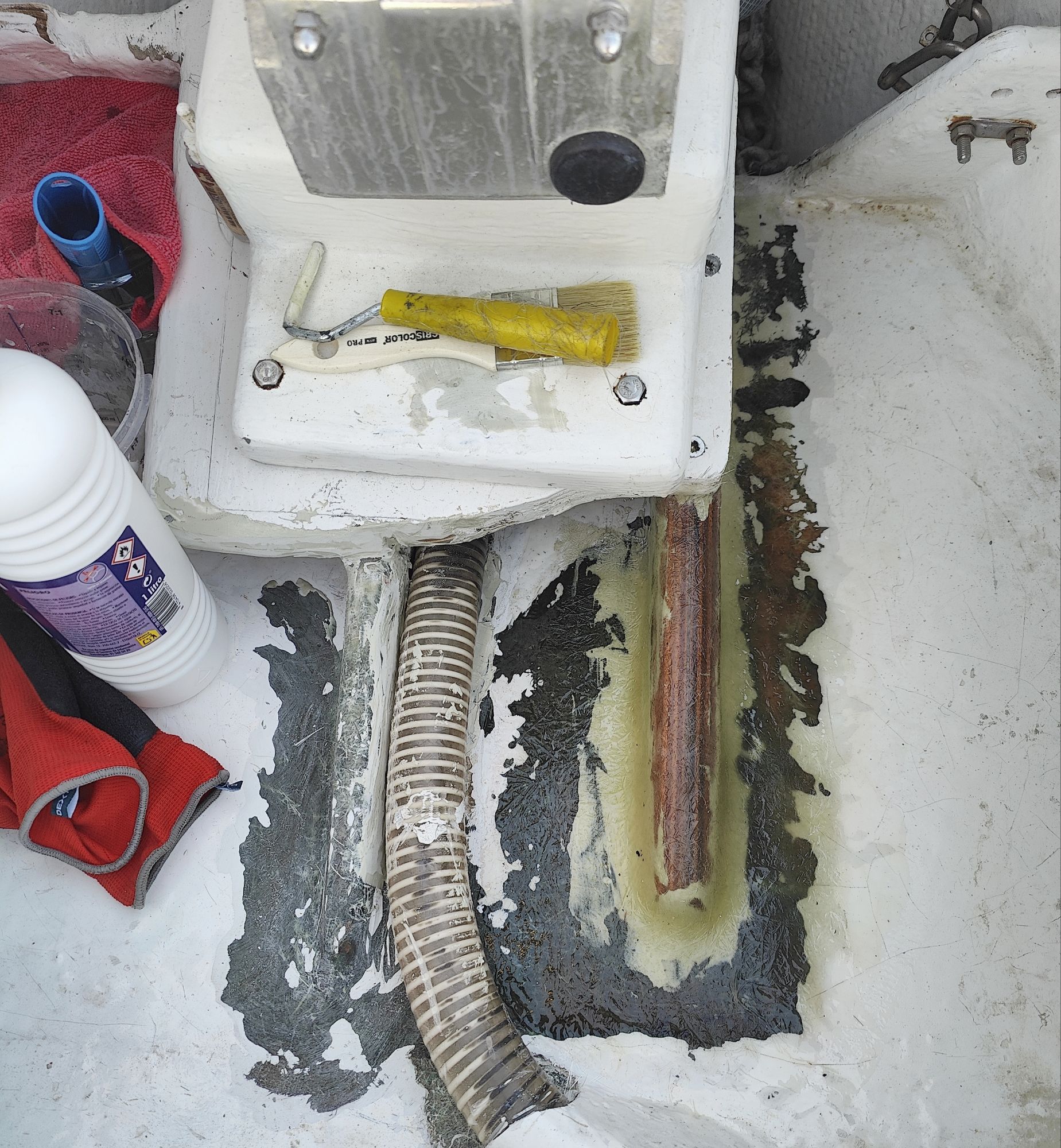 The bottom of the anchor locker must be grinded all the way to fiberglass. The new bulkhead on the right is glued with epoxy both to the windlass bottom and the anchor box bottom. We move the pipe sheltering electric cables several times in order to save the electric cables. Two inox angle irons are mounted with big screws to secure the aft of the joint. There is also a fiberglass elbow in the front end to prevent anchor bed nodding downwards